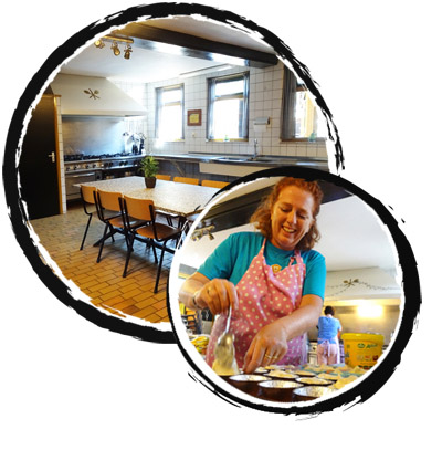 De sfeervolle en praktisch ingerichte keuken van ons verblijfscentrum met zelfkook is volledig afgestemd op zelfverzorging. Groepen die kiezen voor een verblijf beschikken hier over alle nodige comfort om vlot te koken voor grote gezelschappen.